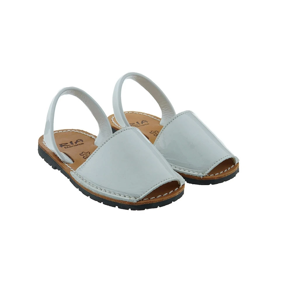 Piel de charol color blanco. Consejos de talla: Calzan el número, pero las menorquinas se recomiendo no elegirlas muy grandes porque con el uso la piel se cede. Las menorquinas RÃa son un básico en el armario de las niñas, siendo el mejor complemento para vestir sus pies en verano. CombÃnalas con un vestido playero para looks más informales o con una falda y una blusa para un look más vestido. Con las abarcas de RÃa, irán niñas y mamás a juego, siendo un calzado para toda la familia. La marca RÃa tiene un trayectoria de más de 60 años, convirtiendo las abarcas en un calzado de moda en todo el mundo.