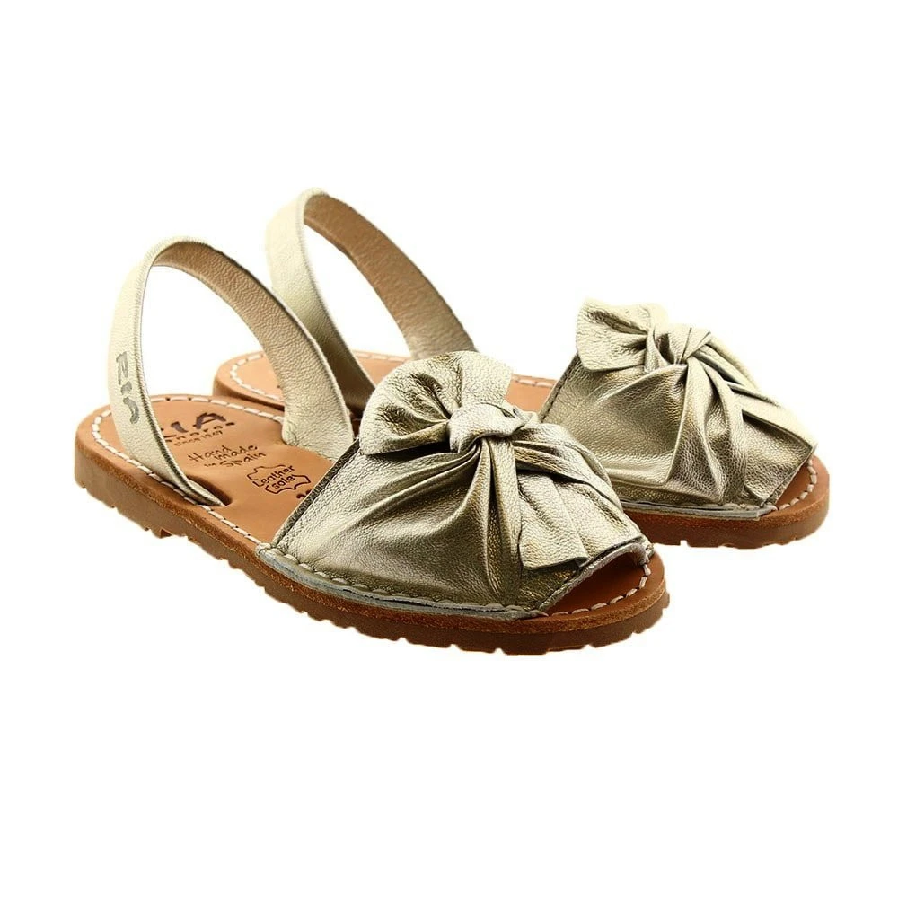 Disponible en diferentes colores, piel metalizada oro y piel metalizada plata. Consejos de talla: Calzan el número. Estas menorquinas tienen un toque vestido gracias a la piel metalizada y a detalle del lazo, por lo que las llevarán las niñas tanto con vestidos como con pantalones cortos.