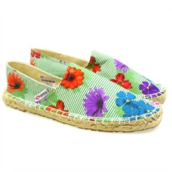 Disponible en diferentes colores, algodón con fondo blanco, rayas rojas y flores multicolor y algodón con fondo blanco, rayas verdes y flores multicolor. Consejos de talla: Calzan el número. Una alpargata de lo más cómoda y práctica para el verano, con un estampado muy animado para combinar con vestidos y shorts.