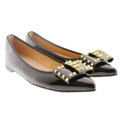 Bailarina de mujer para vestir de MIUXA en piel de charol y acabada en punta. Lleva en la pala de adorno un lazo con pinchos. Forros y planta en piel. Suela de goma antideslizante.