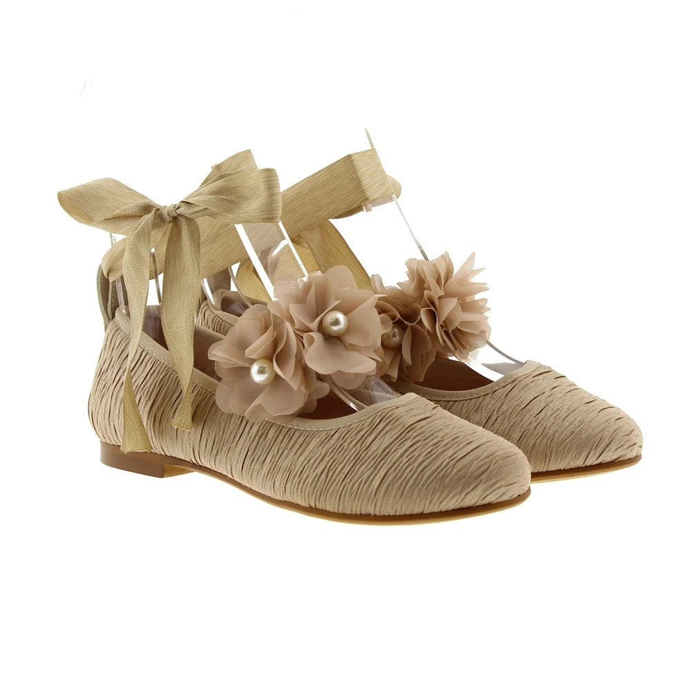 Lino color taupe. Consejos de talla: Calzan el número. La mayor tendencia este año en zapatos de comunión, son las bailarinas tipo ballet, atadas al tobillo. El diseño de este zapato, tan romántico y diferente, es ideal para los vestidos de comunión de estilo vintage, con faldas de tul y fajines de flores. Este tipo de zapatos de comunión, tienen la versatilidad de poder llevarlos después para vestir o para una ceremonia.