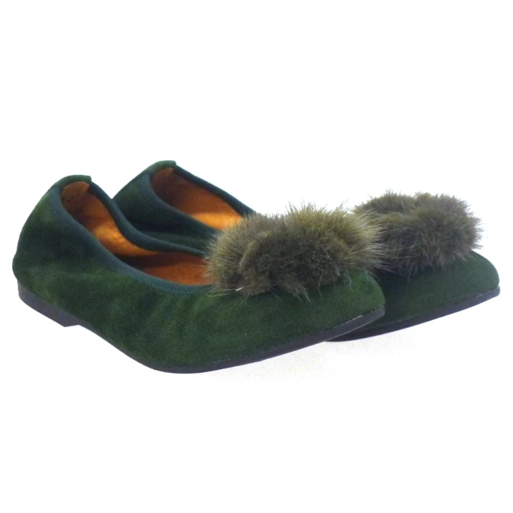 Bailarina de nobuck con pom-pom de visón. Elástico alrededor para una mayor sujeción. Planta de piel transpirable. Suela de crepe flexible. Tacón de 1 cm aproximadamente.