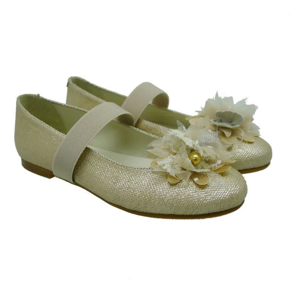 Lino metalizado oro. Consejos de talla: Calzan el número. Una bailarina de lino de última tendencia de comunión. Ideal para vestidos de aire vintage, aunque pasada la comunión, también las podrán combinar con looks de vestir, tanto para el fin de semana como para otro evento o celebración.