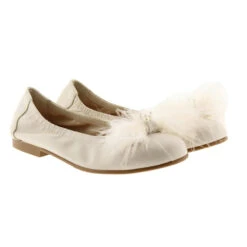 Bailarina de comunión en piel con elástico alrededor para mayor agarre y detalle de plumas y perlas en la pala. Forros y planta en piel. Suela de goma antideslizante.
