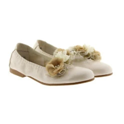 Piel napa color beig con flores al tono y tostado. Consejos de talla: Calzan el número. Los vestidos más tradicionales de comunión, con faldas de vuelo y jaretas, irán acompañados de estas bailarinas. El detalle de las flores en la pala le dan un aspecto mucho más romántico y diferente a la clásica bailarina de comunión. Además de ser muy cómodas gracias a la piel tan suave y blanda.