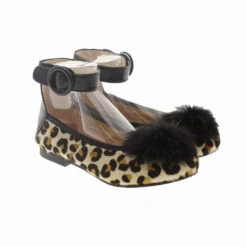 Bailaria para niña en piel de pony con print animal de leopardo y adorno de un pompón en la pala. Lleva pulsera en el tobillo con hebilla para mayor agarre. Forros y planta en piel. Suela de goma antideslizante.