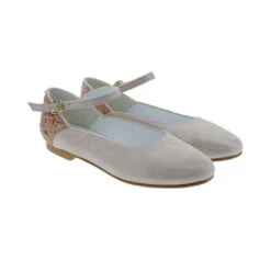 Piel color rosa. Consejos de talla: Calzan el número. La gran tendencia en los complementos y zapatos de comunión este año es el color. Los tonos pastel inundan todos los zapatos de niña, como esta bailarina con hebilla ideal para vestidos blancos o beig con fajines y tocados en rosa.
