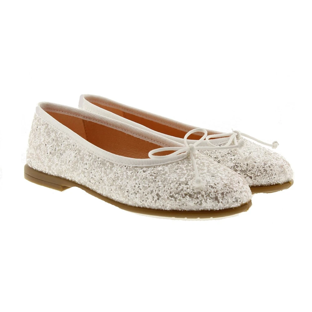 Glitter blanco. Consejos de talla: Calzan el número. El día de su Primera Comunión también podrán llevar brilli brilli en los pies con estas bailarinas de purpurina. Un calzado ideal para ese día tan especial, como para el resto de la temporada, ya que las podrán llevar con un vestido menos formal o en otro evento.