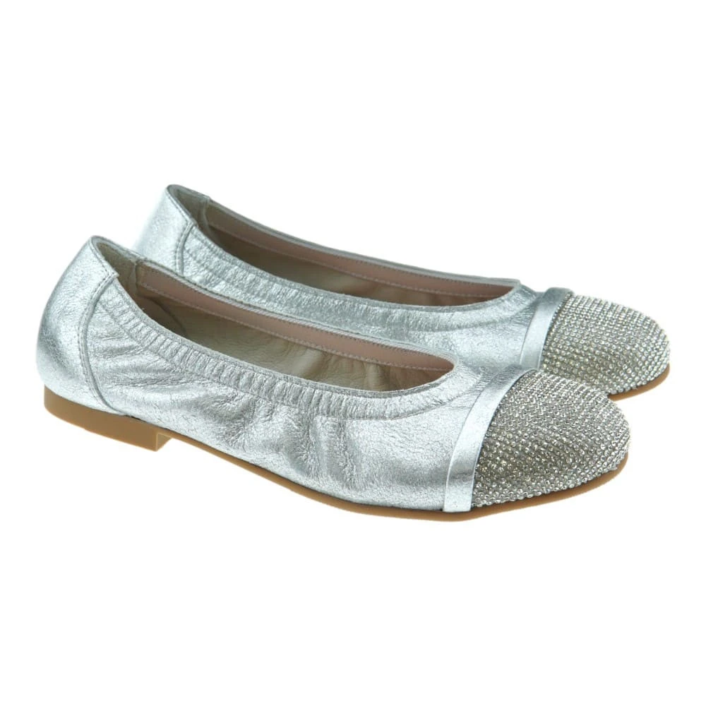 Bailarina de niña para vestir en piel metalizada con elástico alrededor. Adorno de strass en la puntera. Forros y planta de piel. Suela de crepe antideslizante.