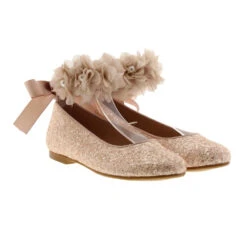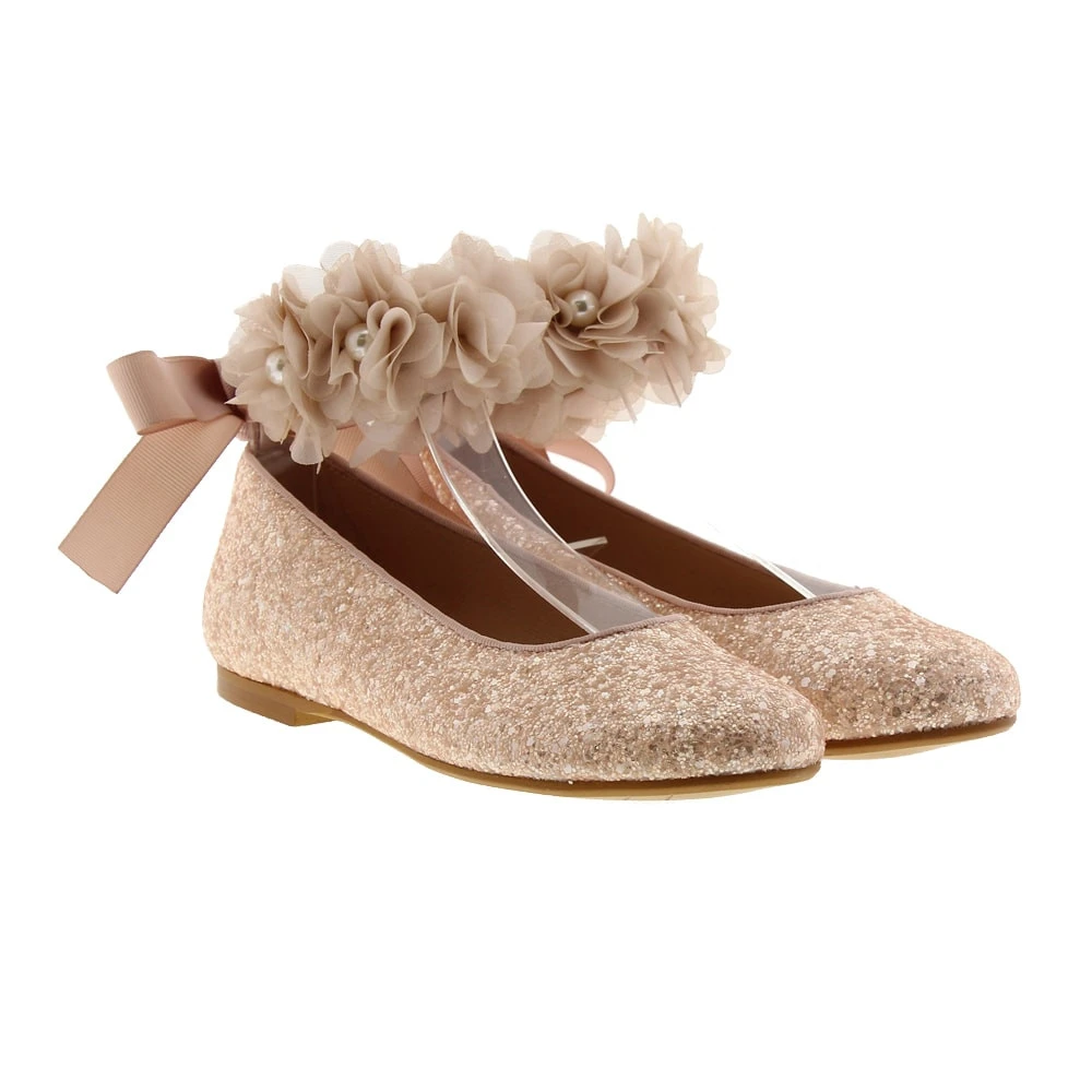 Disponible en diferentes colores, blanco, rosa y azul. Consejos de talla: Calzan el número. La gran ventaja de las bailarinas atadas al tobillo, es la gran sujeción que proporcionan, evitando que se descalcen. Son ideales para vestidos blancos o color beig, con fajines o tocados en rosa o azul. Con la purpurina le daremos un toque muy actual, que contrarresta con la delicadeza de las flores y las perlas. Pasada la comunión, estas bailarinas las podrán llevar en cualquier otro evento o para vestir el fin de semana.