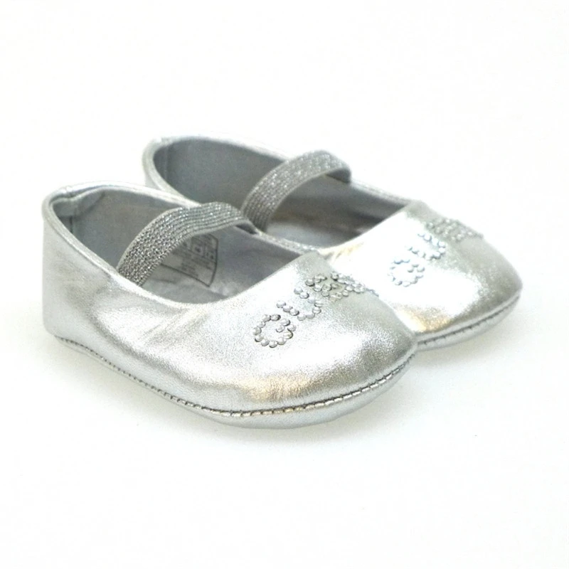 Bailarina para bebé con elástico para que no se le escape el zapato. Piso de cuna. Piel metalizada y letras de la marca realizados en cristalitos.