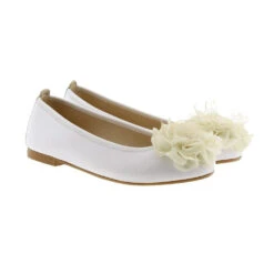 Piel napa blanco. Consejos de talla: Calzan el número. Si el vestido de comunión es blanco y la falda con mucho vuelo, estas bailarinas son ideales para combinar. Esta temporada vuelven los zapatos con adornos voluminosos como estas cocas.