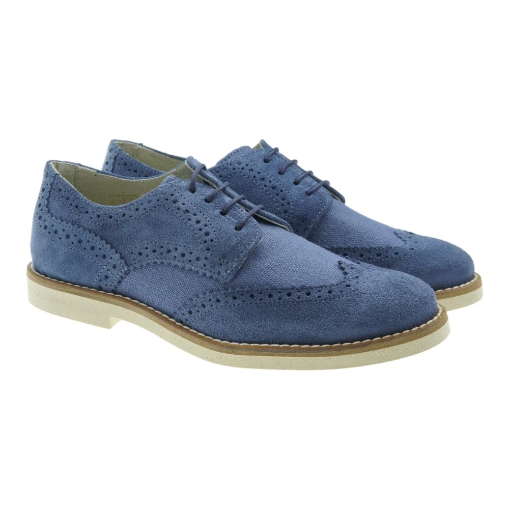 Empieza la época de comuniones, y uno de los zapatos más buscados para los niños son los bluchers de cordón en piel de serraje combinado con lino. Este zapato lleva de adorno la piel con picado tanto en la pala como en los laterales. Los forros son de piel y la suela de goma Eva antideslizante.