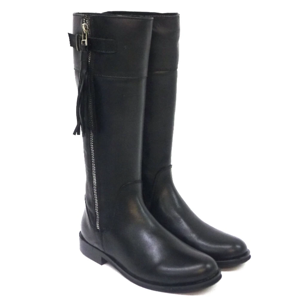 Bota alta en piel, cremallera lateral de adorno con borla. Forros y planta de piel transpirable. Suela fina de goma, con tacón de 1,5 cm aproximadamente.