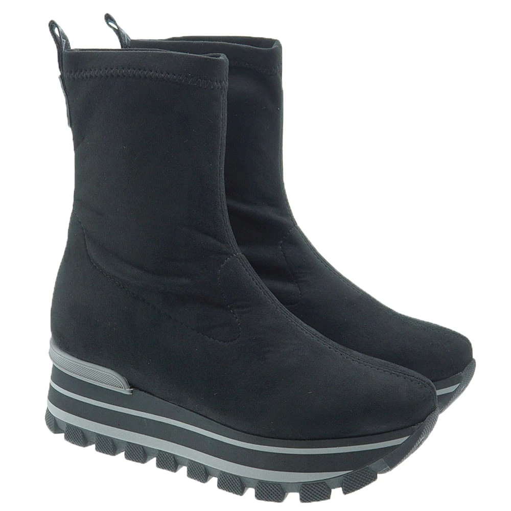 Estas botas de mujer tienen un estilo deportivo ideal para todos los días. PEDRO MIRALLES ha lanzado estos botines elásticos con un tejido impermeable que se ajustan al tobillo como una segunda piel. Llevan plataforma para mayor comodidad. La suela es de caucho y la plataforma mide 5 cm en la zona del talón y 4 cm en la zona delantera.
