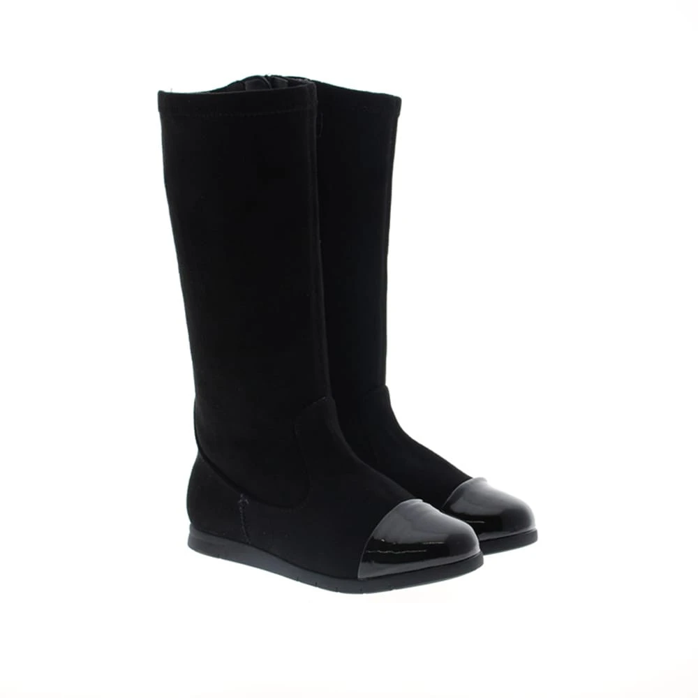 Bota elástica de licra para niña de UNISA con puntera de charol y cierre de cremallera lateral. Planta en piel. Suela de goma antideslizante.