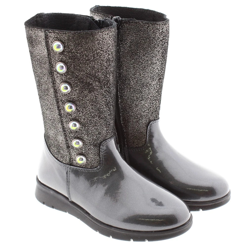 Piel de charol gris con caña metalizada acero. Consejos de talla: Calzan el número. Este tipo de botas abrigarán los pies de tu hija este invierno, además de ser cómodas y prácticas. A la hora de combinar, elige vestidos y bermudas para vestir el fin de semana.