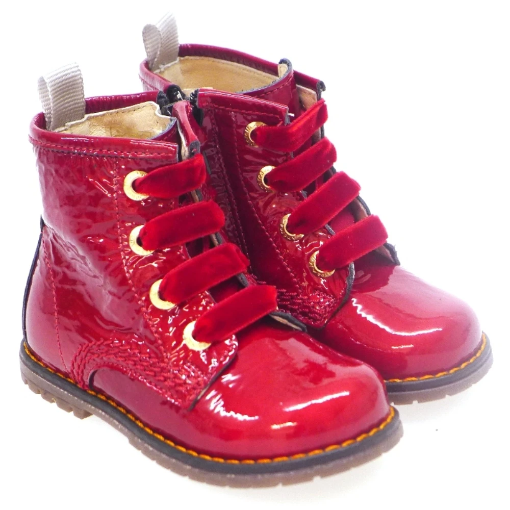 Piel charol rojo. Consejos de talla: Calzan su número. Una bota unisex que podrás combinar tanto con pantalones para niño como con vestidos para niña. Muy cómoda, práctica y fácil de limpiar.