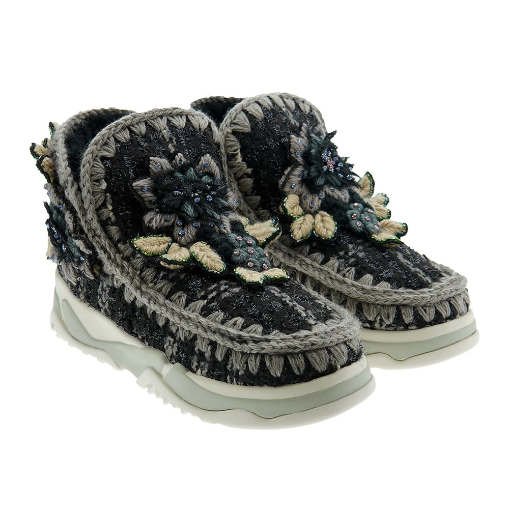 Este invierno las botas australianas de MOU se llevan tipo sneakers. Estas zapatillas de tartán llevan de adorno unas flores bordadas con cristales y lana en el empeine. Las costuras de ganchillo están hechas a mano. Van forradas de auténtica piel de oveja para mantener el pie cálido en invierno y las suelas son de goma antideslizante.