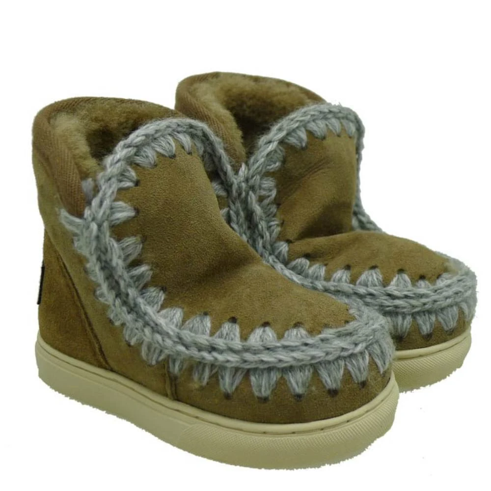 Botín para niña y niño en piel de nobuck de MOU con pespuntes decorativos cosidos a mano. Forros y planta en piel de oveja que mantiene la temperatura sin pasar calor. Suela de goma antideslizante.