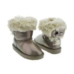 Este invierno vuelven las botas australianas de CONGUITOS para las niñas más pequeñas. Esta temporada vienen con un acabado metalizado brillante y con el detalle del lazo detrás. El interior es de pelito muy suave y la suela de goma antideslizante.