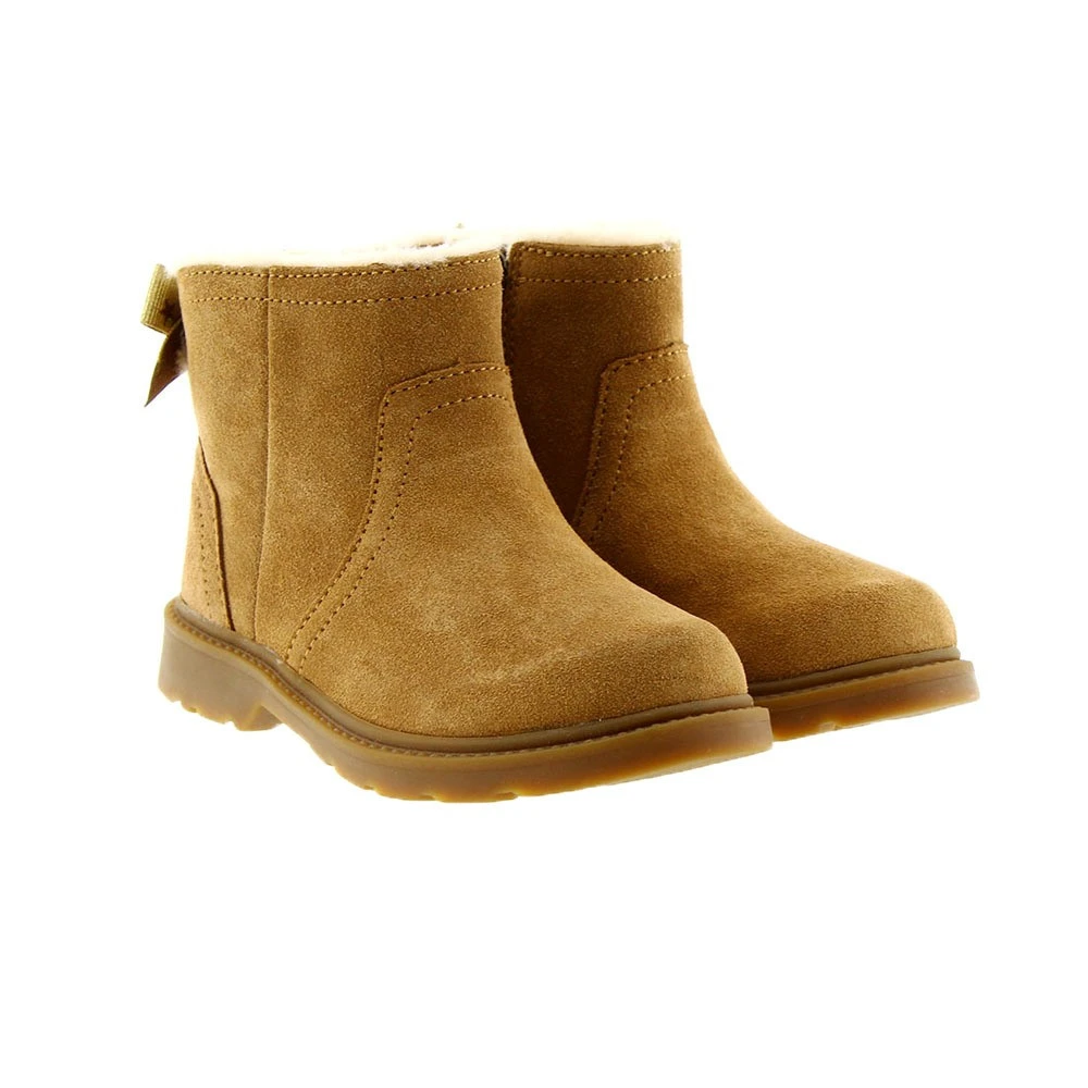 La reconocida marca UGG también cuenta con botas para niña de estilo más casual. Esta bota tipo campera, también lleva piel de cordero en la parte superior, como las clásicas australianas. Este modelo lleva de adorno en la parte trasera de la caña un lazo dorado con estrellas. El el lateral interior lleva cierre de cremallera y la suela es de goma antideslizante.