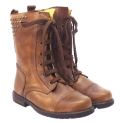 BotÃn caña media con cierre de cremallera y cordones ajustables. Adorno de tachas en la parte de arriba de la caña. Forros y planta de piel transpirable. Suela en goma flexible.