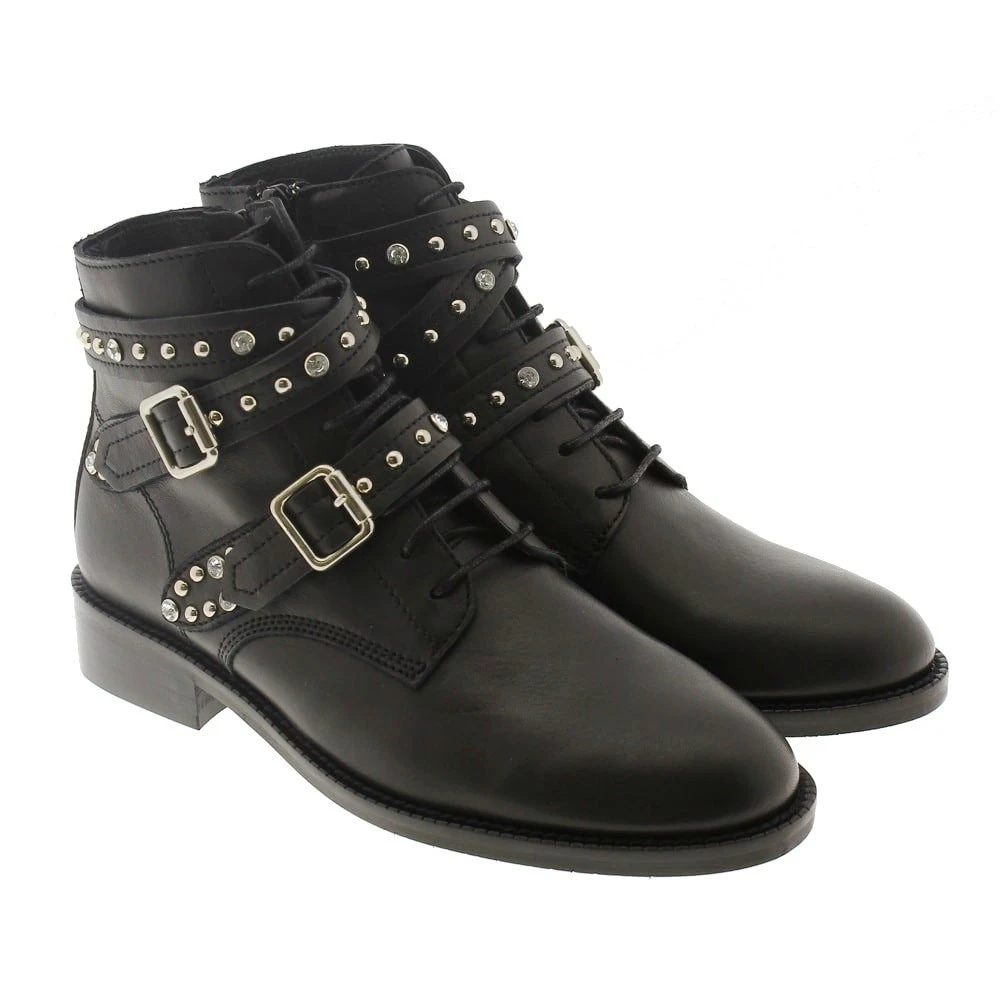 Disponible en diferentes colores y pieles, piel de pony print animal y piel napa negro. Consejos de talla: Calzan el número. El detalle de las hebillas y los cristales le da un toque cañero al botín, siendo el calzado ideal para llevar con unos vaqueros capri o con un vestido vaporoso estampado.