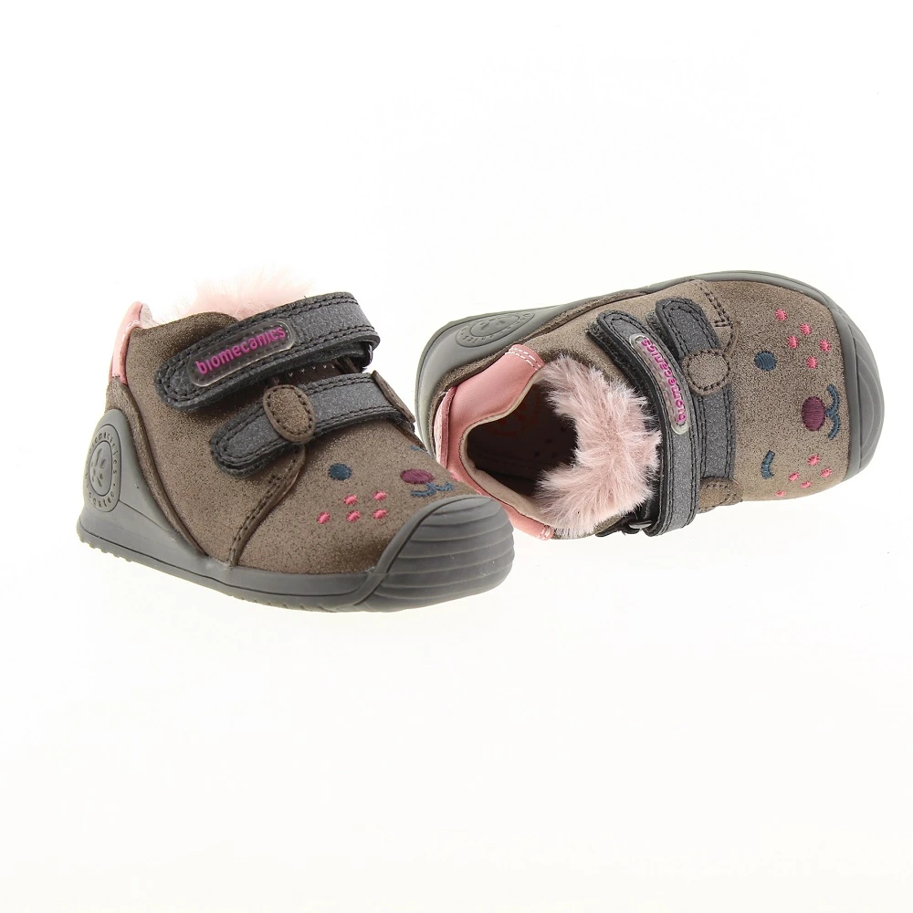 Estos zapatitos de sport vestirán los pies de las peques en sus primeros pasos. BIOMECANICS se caracteriza por su estilo deportivo y por tener contrafuertes armados y suelas flexibles. Lo que más llama la atención es el detalle de la lengüeta de pelo y los bordados como si fuera una carita. Los cierres son de velcro y el interior de piel.