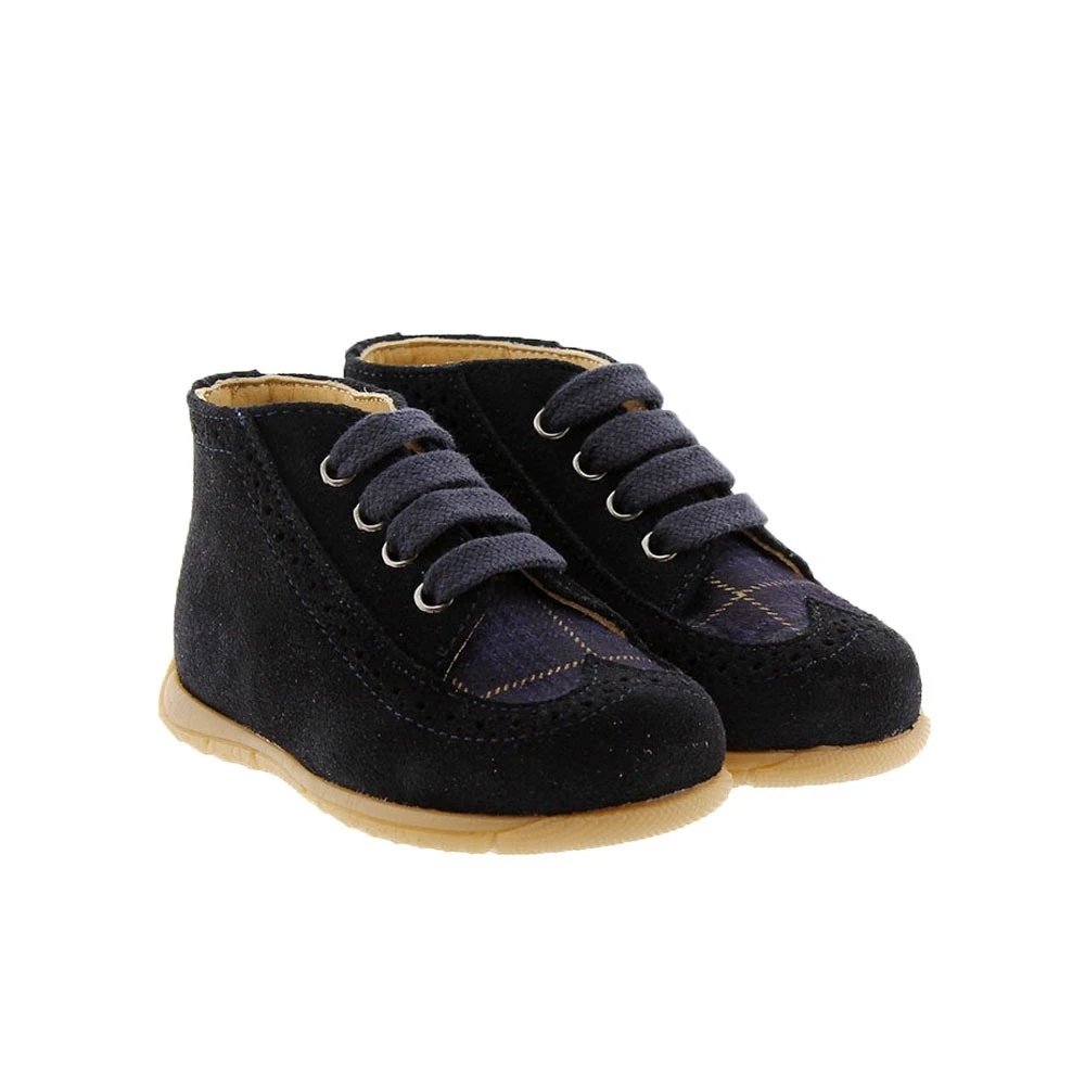 Estas botitas de cordón para primeros pasos, vestirán los pies de tu bebé cuando comience a caminar. Son muy blanditas gracias a la piel de nobuck y llevan la lengüeta con estampado de cuadros. El interior es de piel y la suela de goma antideslizante.