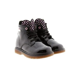 Piel de charol negro. Consejos de talla: Calzan el número. Las niñas más pequeñas irán este invierno con las botas más buscadas del momentos, las botas militares. Este modelo es ideal para combinar con un pantalón pitillo o vaquero o con un vestido informal de punto y un abrigo de pelo.