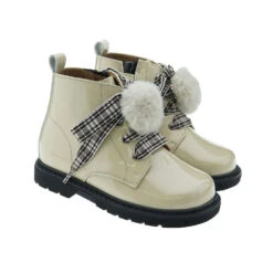 Disponible en diferentes colores, piel de charol gris, piel de charol rosa y piel de charol beig. Consejos de talla: Calzan el número. Las botas de estilo militar están más de moda que nunca, incluso para las niñas más pequeñas. Para que sean más versátiles y las puedan llevar también para vestir, estas botas son de charol y llevan el detalle de los pompones.