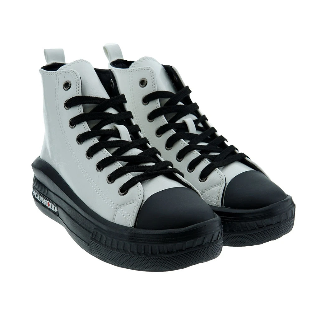 Charol blanco. Consejos de talla: Calzan el número. Para llevar a diario el estilo más combinable con tejanos y vestidos más informales, son este tipo de botas de sport. Son muy cómodas y estilosas gracias a la suela ancha de goma.