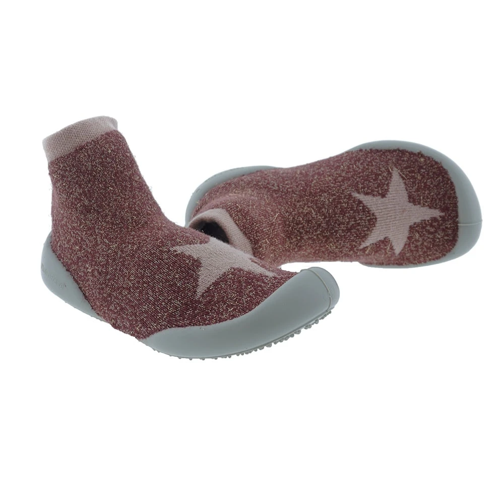 Si buscas unas zapatillas de casa para llevarlas a juego con tu hija, no dejes escapar estos calcetines con suela de la marca COLLEGIEN. Están fabricados en algodón con hilos brillantes y llevan de adorno una estrella en otro color. La planta es ergonómica y la suela muy flexible y antideslizante.