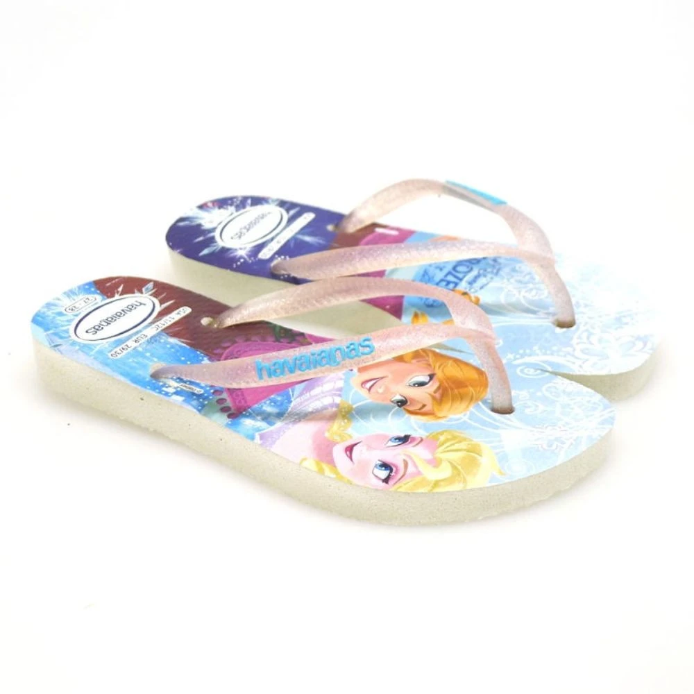 A tu hija le encantarán las chanclas de Frozen de la marca HAVAIANAS para ir a la playa o a la piscina. Este modelo es de tira fina y va adornado con el logo de la marca.