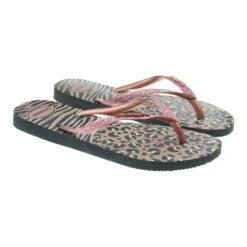 Las chanclas más originales para joven y mujer para este verano son las de HAVAIANAS. Estas chanclas slim, llevan el logo de la marca en la tira cubierta de glitter con la planta animal print con relieve de grano de arroz. Las suelas son muy ligeras y antideslizantes.