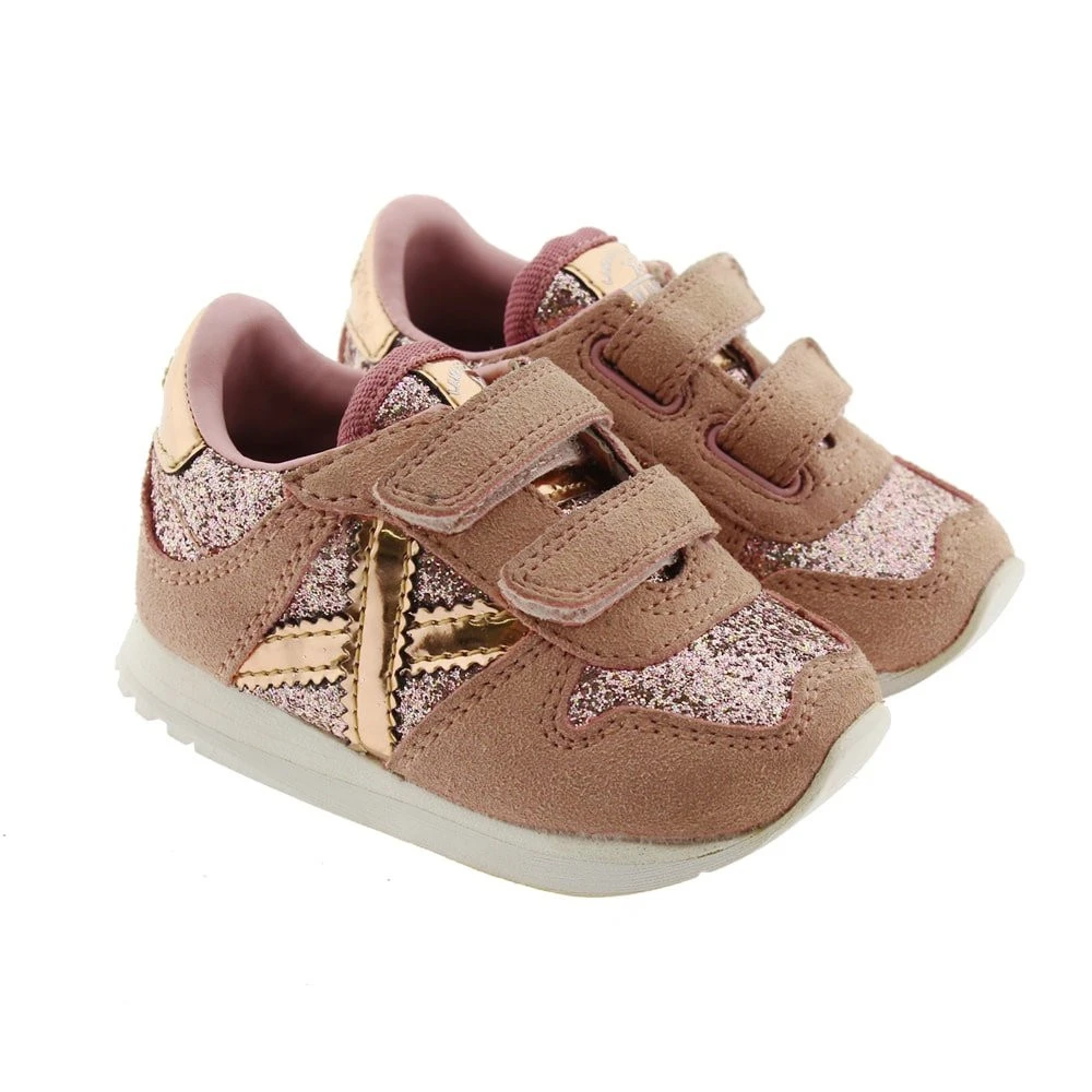 Zapatilla para bebé primeros pasos de MUNICH en piel de nobuck con el logo los laterales. Cierre de velcros. Forros y planta en algodón. Suela de goma antideslizante.