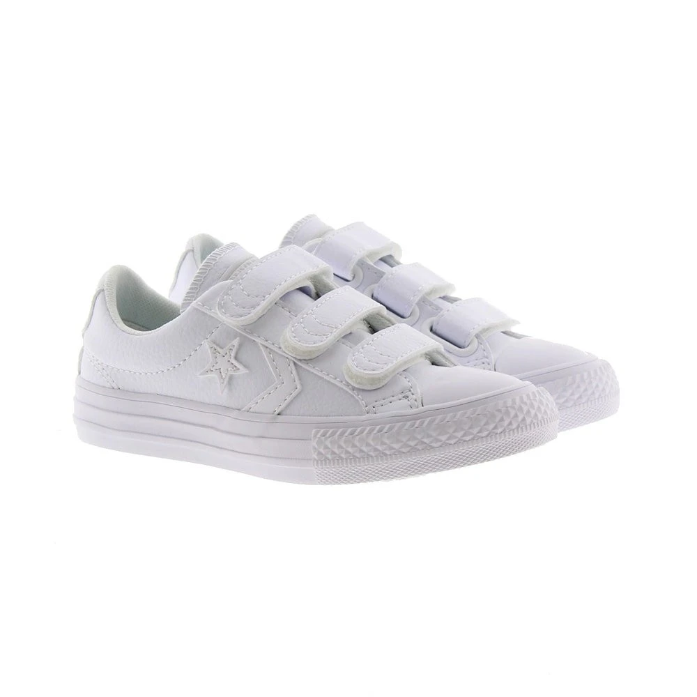 Ha llegado el momento de preparar las nuevas deportivas de los niños para el colegio y una opción son las zapatillas en piel de CONVERSE. Este modelo se caracteriza por la estrella en el lateral y tiene cierre de tres velcros.