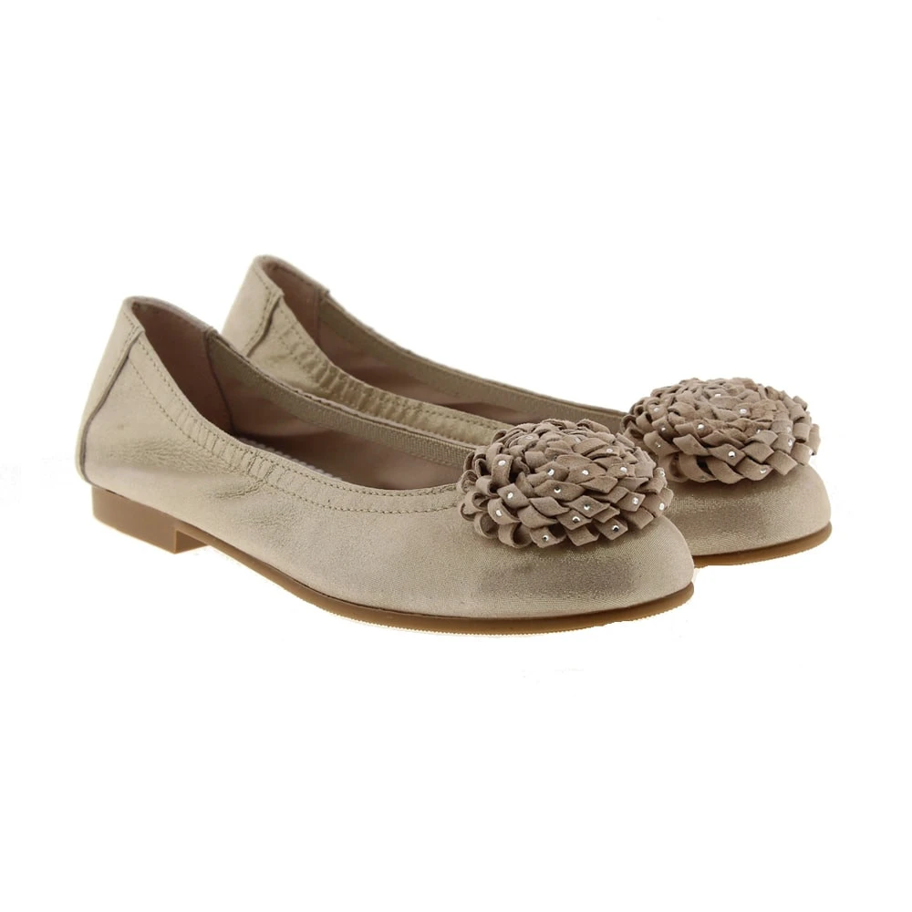 Piel de ante color nude. Consejos de talla: Calzan el número. Los vestidos de comunión más actuales y modernos, con tules y fajines de flores de colores, son los más idóneos para combinar con estas bailarinas. Gracias al elástico de alrededor, llevarán el pie sujeto, además de tener una piel muy blanda y suave. Un zapato de última tendencia para comunión.
