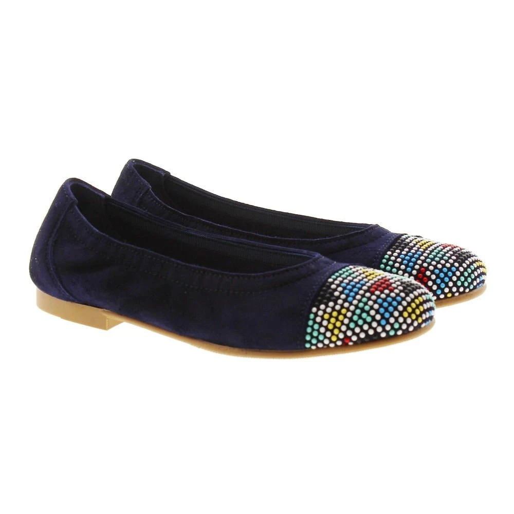 Manoletina para niña en piel de nobuck, con elásticos alrededor para mayor agarre y sujeción. La puntera va adornada de abalorios de colores. Forros y planta en piel. Suela de goma antideslizante.