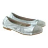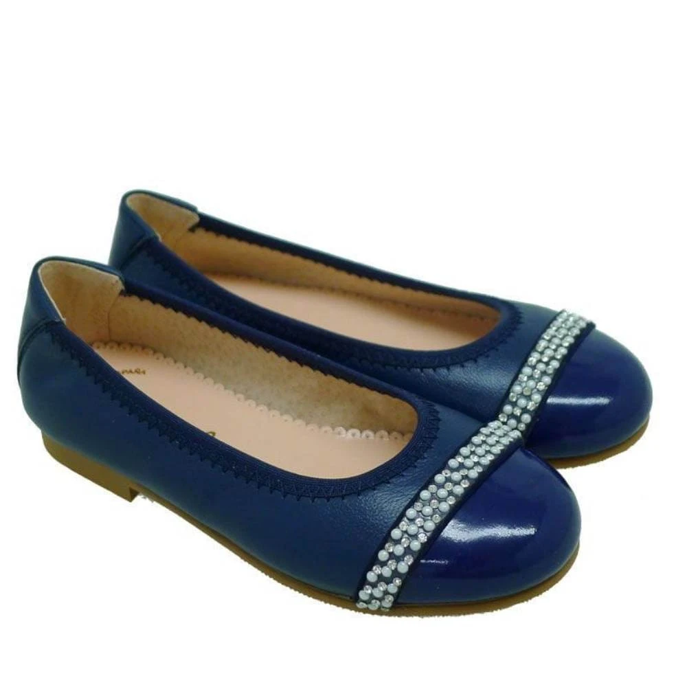 Bailarina de comunión en piel metalizada con elástico alrededor para mayor agarre. Lleva la puntera de charol y adorno de perlas y strass en la pala. Forros y planta en piel. Suela de goma antideslizante.