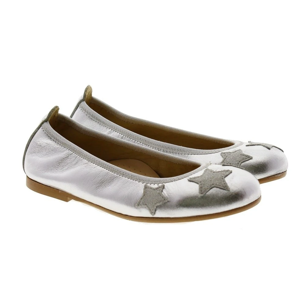 Bailarinas metalizadas de CLARYS con elástico alrededor para mayor sujeción y agarre. Lleva de adorno en la pala unas estrellas con glitter. Forros y planta con formativo en piel. Suela de goma antideslizante.