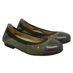 Bailarinas para niña y joven, en piel de nobuck, con puntera de charol y adornada con estrellas metalizadas. Elástico alrededor para mayor sujeción. Forros y planta en piel. Suela de goma antideslizante.