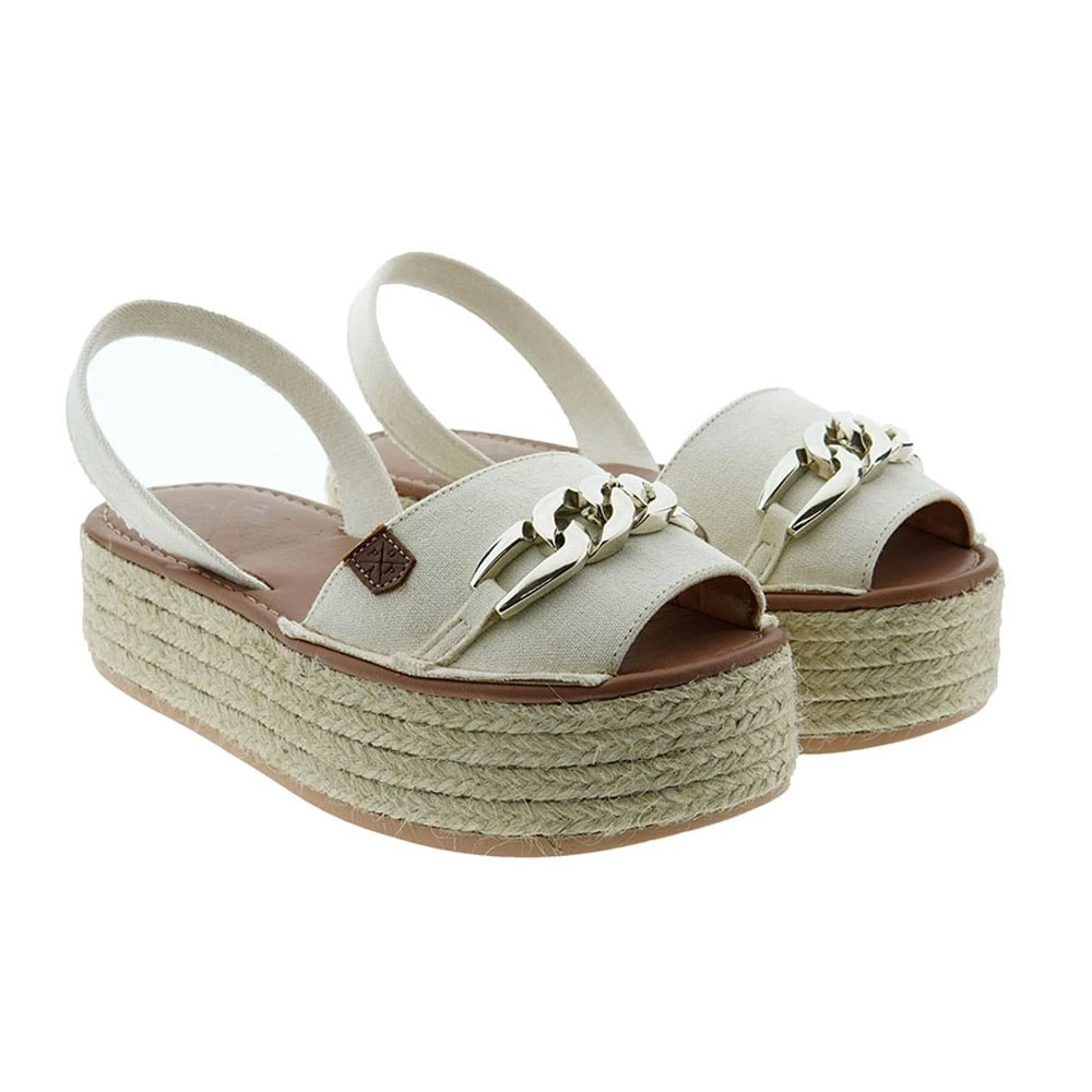 Con un adorno de una gran cadena en la pala, estas nuevas menorquinas con plataforma de yute trenzado de la marca POPA son lo más para este verano. Están fabricadas con pique reciclado y la planta mullida soft para mayor comodidad al pisar. La plataforma tiene una altura de 4,5 cm aproximadamente.