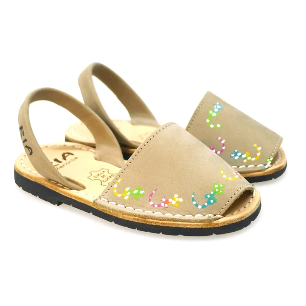 El dibujo de las lagartijas de colores pintadas a mano es lo que diferencia a esta menorquina del resto. La marca RÍA especialista en la fabricación de menorquinas de la isla, lanza este modelo en piel de nobuck con el logo en la suela y en la tira del talón. El interior es de piel y la suela de caucho de neumático. Piel nobuck arena con lagartijas multicolor. Consejos de talla: Calzan el número, les recomendamos no elegirlas muy grandes, ya que con el uso la piel cede. Un calzado que no puede faltar en el armario de los niños para llevar de diario. Estas menorquinas tienen el sello de garantía de avarcas de la isla.