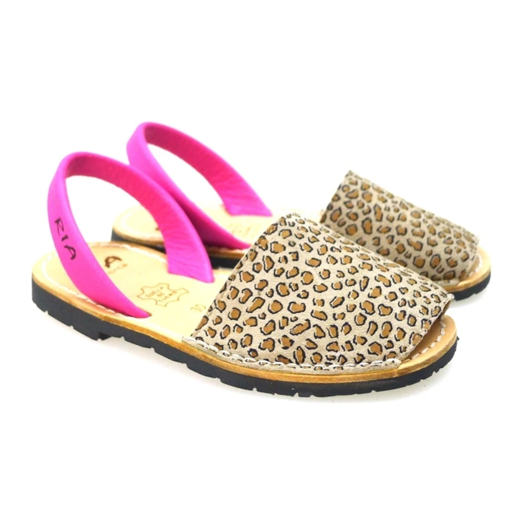 Avarcas de niña de la tradicional marca RIA, fabricadas artesanalmente con materiales de gran calidad. Este modelo está fabricado en piel de nobuck con estampado de leopardo y con tira en el talón en napa o en piel metalizada, adornadas con el logo de la marca. La planta es de cuero y también lleva el logo de la firma. La suela es antideslizante de neumático.