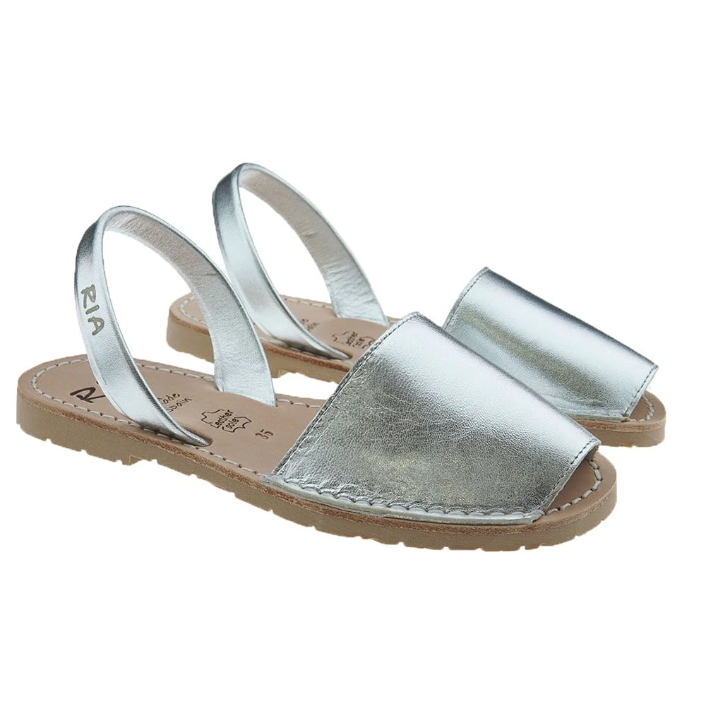 Abarcas para mujer en piel metalizada de la original marca RIA. Las menorquinas Ría están fabricadas a mano con los mejores materiales, como el cuero de la planta adornada con el logo de la marca. La tira del talón es firme para mayor agarre, y también lleva el logo de Ría. Suela de llanta antideslizante.