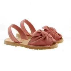 Menorquinas para niña de RIA en piel de ante con adorno de un lazo en la pala. Forros y planta en piel. Logo de la firma en el lateral de la tira y en la suela. Con la tradicional suela de neumático.