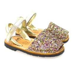 Disponible en diferentes colores, glitter oro multicolor, glitter oro rosa y glitter combinado oro y plata. Consejos de talla: Calzan el número, les recomendamos no elegirlas muy grandes, ya que con el uso la piel cede. Un calzado que no puede faltar. RIA cuenta con más de 60 años de trayectoria, de empresa familiar que ha logrado convertir el calzado tradicional de la isla en un producto de moda. Un modelo para los más peques gracias a su velcro, que les permitira una mayor comodidad y sujeción. Las niñas más pequeñas también llevarán este verano las menorquinas más buscadas del momento, las abarcas cubiertas de purpurina. A las niñas les encantarán y lo mejor de todo es que niñas y mamás podréis ir con las mismas.