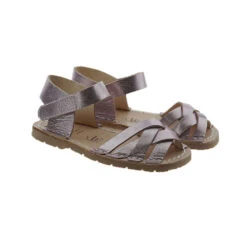Como si fuera una sandalias, estas menorquinas de niña de la marca RIA están fabricadas en piel metalizada y llevan talón cerrado y multi tiras en la pala. El cierre es de velcro para que lleven el pie más sujeto. Los forros y la planta son de piel y la suela de caucho de neumático.